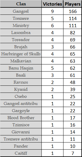 As always, I want to thank all the people who are working with the tournament information, creating tools where we can check all the data for the decks and participants: El Setita Loco (also has a blog, and I have incorporated a link in the sites section), the VEKN, VTES decks, VDB, and BCN Crisis. I also want to praise all those princes and tournament runners, that are providing and publishing the info of those events. It is quite valuable for our tools. And I encourage all players to support this publicity by sharing the info, their experiences and their decks with the community.